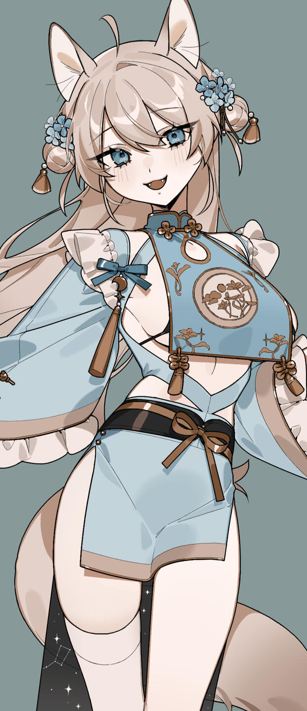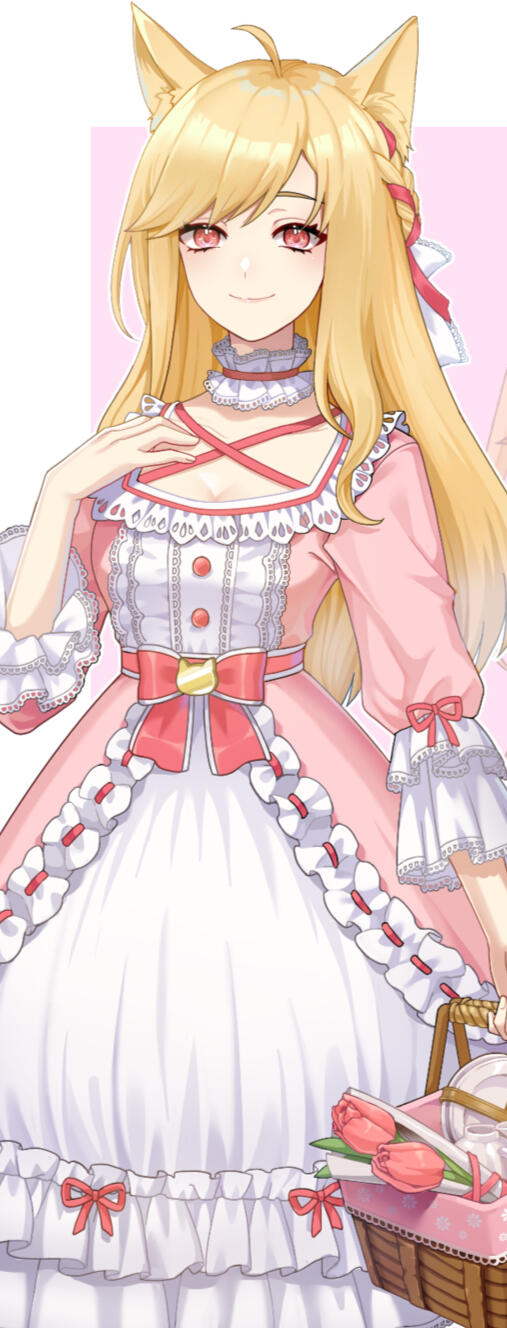 人類型態長著貓耳和澎澎的尾巴,貓型態是有著淺金毛色的火焰布偶貓